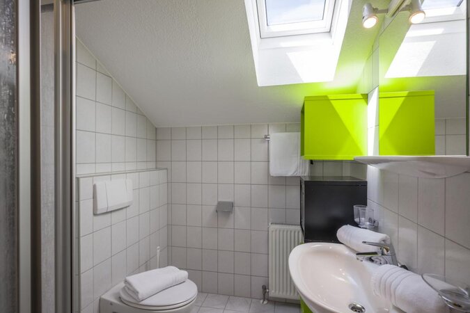 - Badezimmer: Waschbecken, Dusche, Toilette