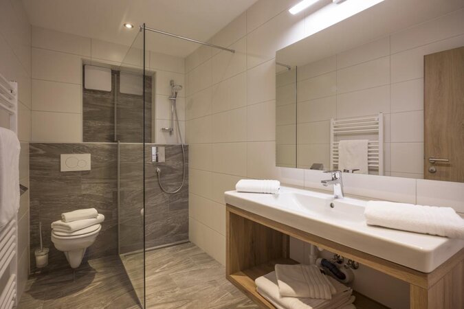 - Badezimmer 1: Waschbecken, Dusche und Toilette